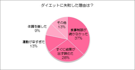 同調査によると、ダイエットに失敗した理由で最も多かったのが「食事制限が続かなかった」で37%。次いで「すぐにダイエット効果が出ず諦めた」28%、「運動が辛すぎた」13%と続きました。