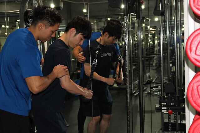 次に、腕の上腕三頭筋を鍛えるためのケーブルプッシュダウンを教えてもらいました。