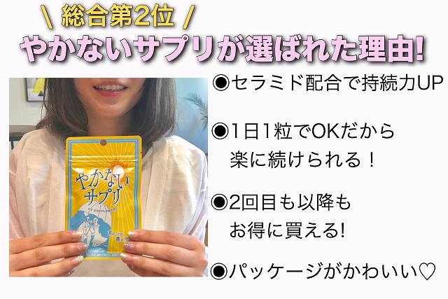 セラミド、フィトール、シダ植物抽出物など注目の美容成分がたっぷりと配合されている「やかないサプリ」。