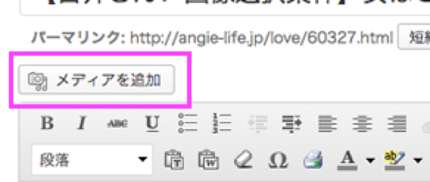 画像挿入位置にカーソルを置いた状態で、「メディアを追加」をクリック。
