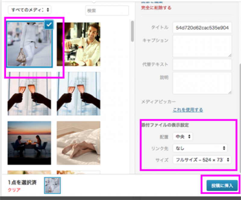 ファイルの表示設定を、必ず以下の設定にしてから「投稿に挿入」。