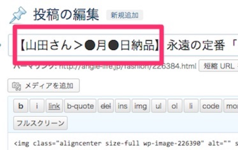 完成したら、記事タイトルをタイトル欄に入力し、タイトルの先頭に納品日と担当名を【●●さん>×月▲日】の形式で先頭に記入。