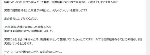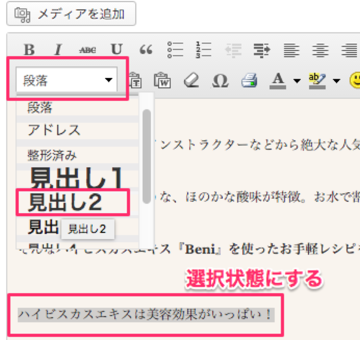 文中の見出し部分は、「見出し2」に設定してください(テキストモードでは、「h2」のボタンです)。