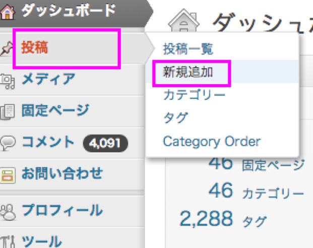 WordPress左カラム「投稿」→「新規追加」をクリック